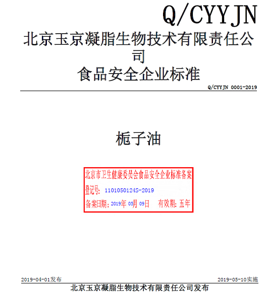北京玉京凝脂生物技術有限責任公司本次備案的企業標準《梔子油》,經過我公司技術人員朱麗真老師的編寫、備案,所提交的材料符合北京市衛健委的備案要求,于2019年05月成功備案并在北京市食品安全標準管理系統公示