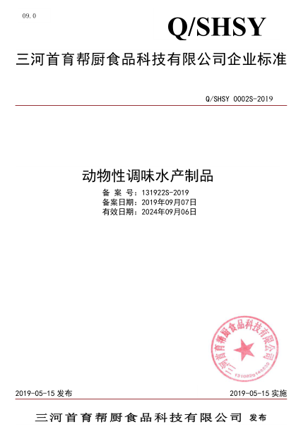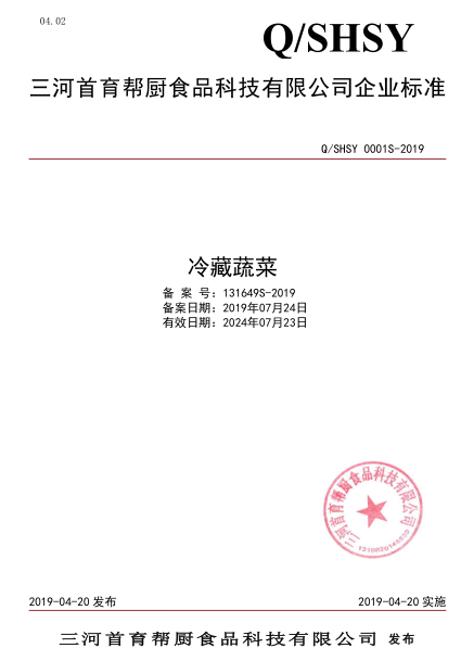 三河首育幫廚食品科技有限公司本次備案的企業標準《動物性調味水產制品》、《冷藏蔬菜》,經過我公司技術人員池建敏老師的編寫、公示、備案,所提交的材料符合河北省衛健委的備案要求,于2019年09月成功備案并在河北省衛健委食品安全標準信息平臺公示。