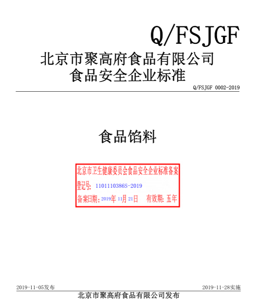 北京市聚高府食品有限公司本次備案的企業(yè)標準《食品餡料》,經(jīng)過我公司技術人員張炳福老師的編寫、備案,所提交的材料符合北京市衛(wèi)健委的備案要求,于2019年11月成功備案并在北京市食品安全標準管理系統(tǒng)公示。