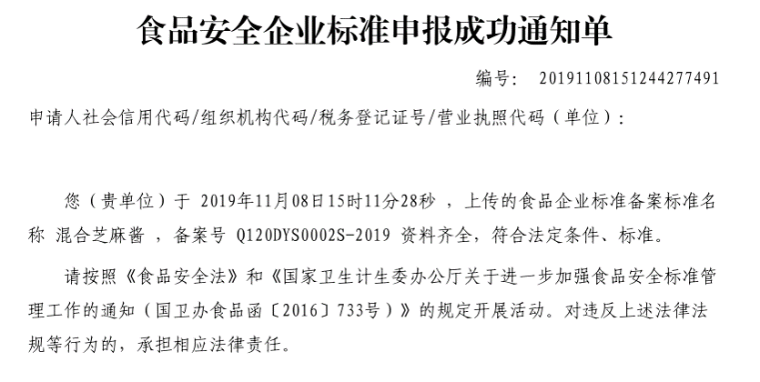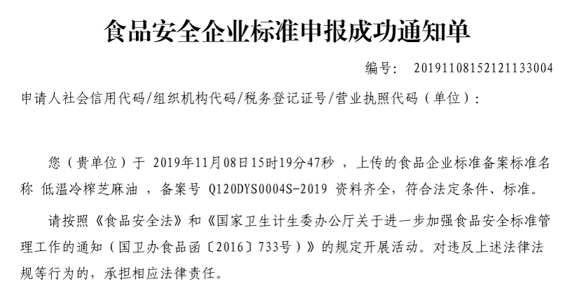 天津東宇順油脂股份有限公司本次備案的企業(yè)標準《低溫冷榨芝麻油》、《混合芝麻醬》、《醇香芝麻醬》,經過我公司技術人員朱麗真老師的編寫、備案,所提交的材料符合天津市衛(wèi)健委的備案要求,于2019年11月成功備案。