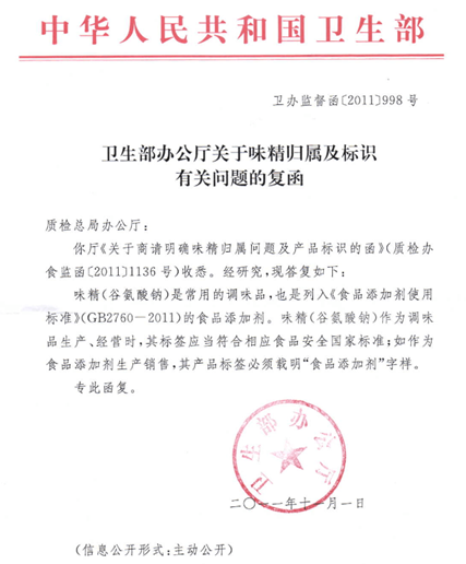 附件:衛生部辦公廳關于味精歸屬及標識有關問題的復函