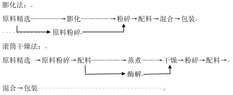 原料精選;配料;酶解;蒸煮;干燥;混合;包裝。